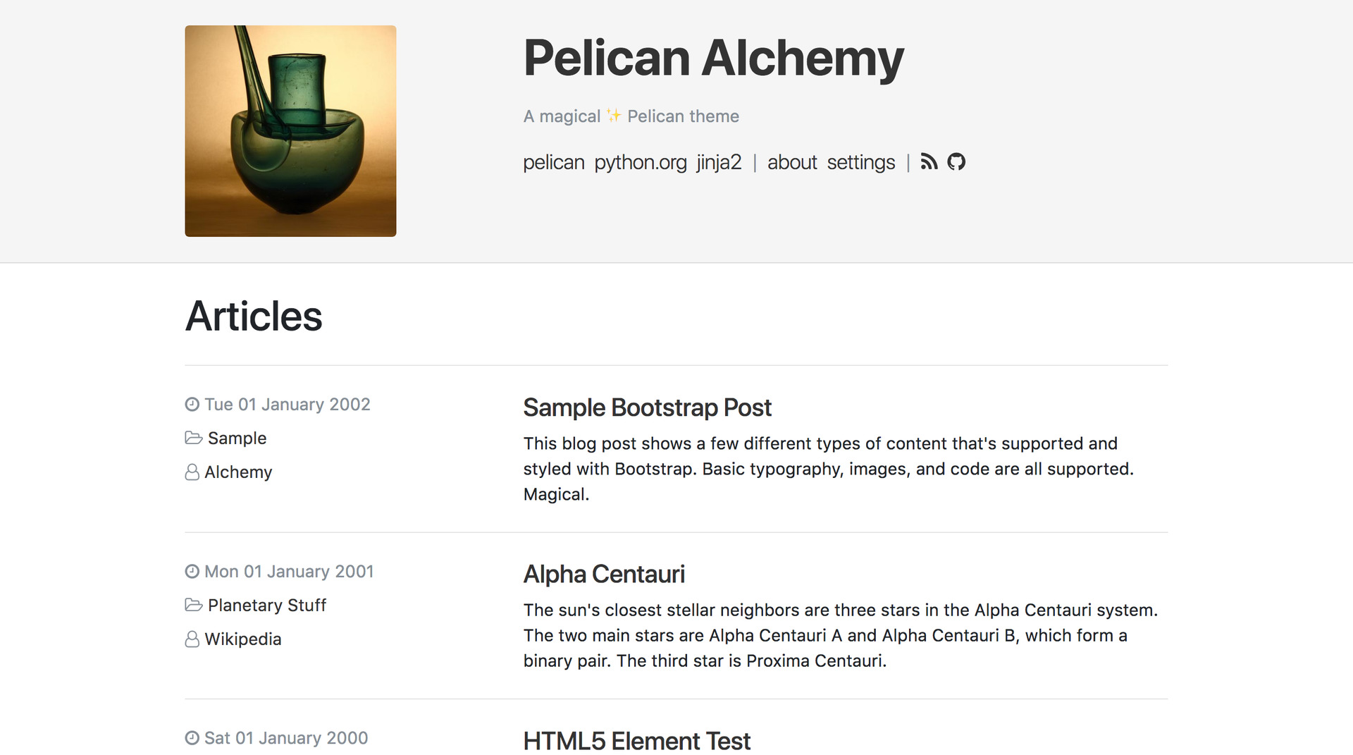 Alchemy is a functional, clean, responsive theme for the Pelican static site generator.